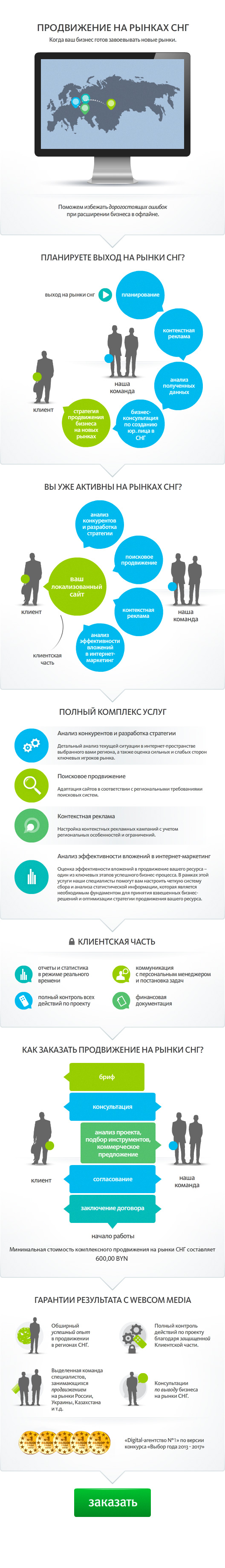 Компания Webcom Performance предлагает полный комплекс услуг по продвижению бизнеса в интернете. В вашем распоряжении весь опыт работы нашей команды с масштабными проектами, ориентированными на российскую, украинскую, казахскую аудиторию. Мы учитываем экономические и юридические особенности бизнеса в России и странах СНГ, предлагаем эффективные и оптимальные по затратам стратегии расширения вашего присутствия на рынке.Планируете выход за рубеж? Давайте попробуем